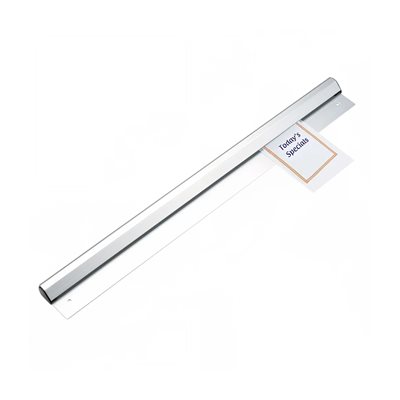 Aluminium. Holds paper in place using heat-resistant glass marbles. Easily usable with one hand.